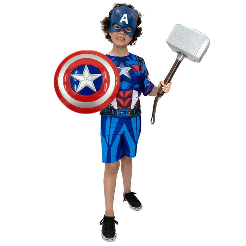 Fantasia capitão América Infantil com mascara, escudo e martelo Thor, modelo curto para o verão, os meninos vão amar ter a fantasia do seu super herói preferido.