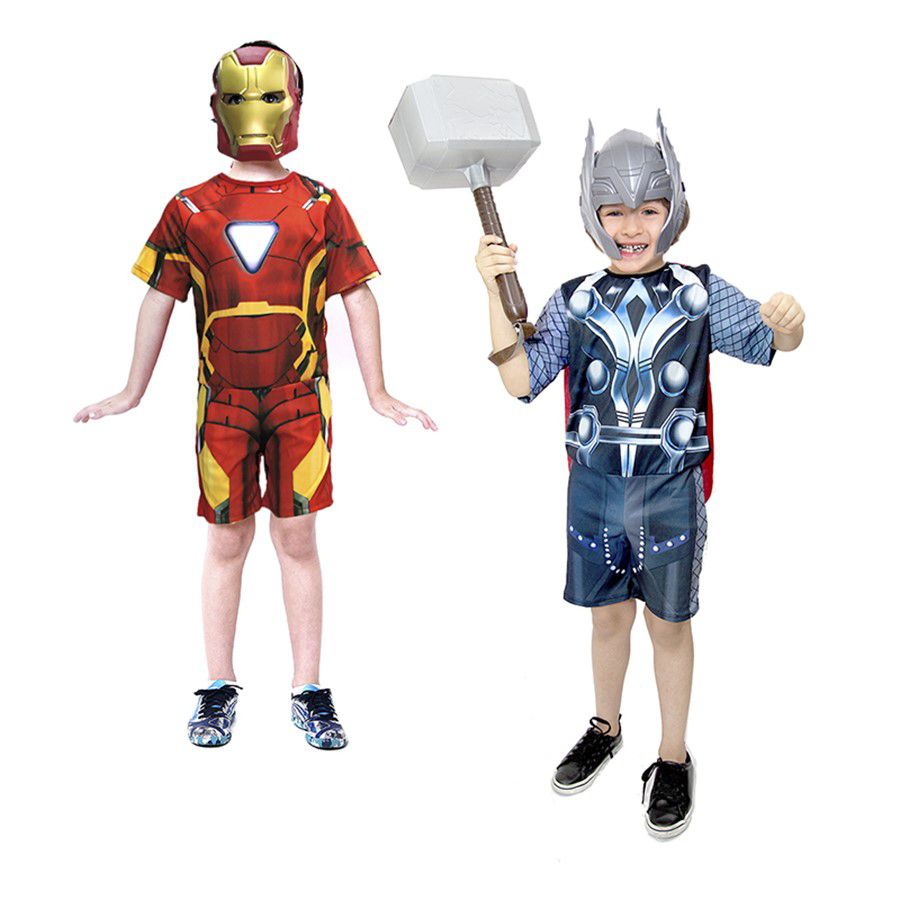 Kit Homem de Ferro e Thor, embalagem contém: 2 fantasias ,2 máscaras e 1 martelo.