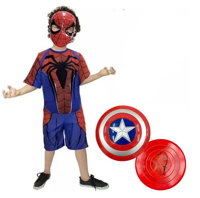 Fantasia homem aranha com mascara e escudo Capitão América, fantasias para os pequenos se divertir, brincar e encantar.