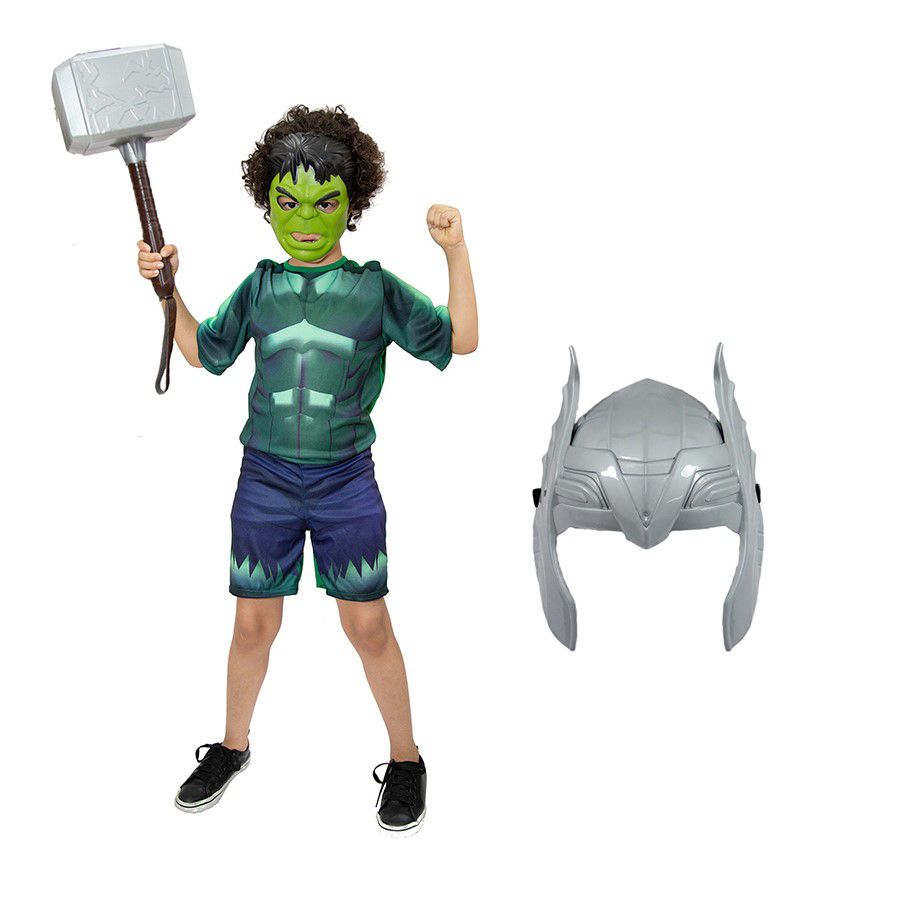 Informações do Produto: a embalagem contem 1 macacão, 2 mascaras (Hulk e Thor) e 1 martelo Thor.
