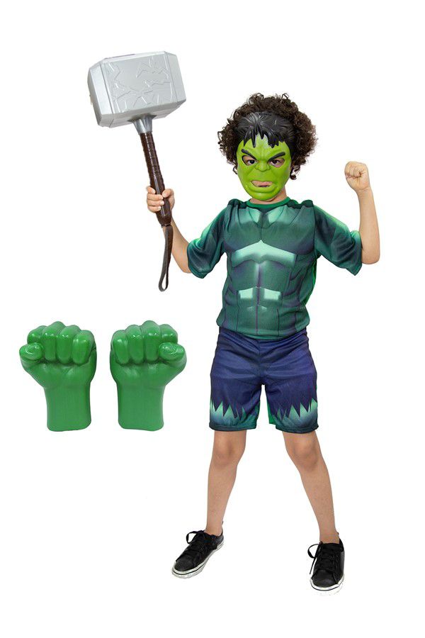 Fantasia Hulk com luva e mascara e martelo Thor, o pequeno adorarará se vestir de seu herói favorito.