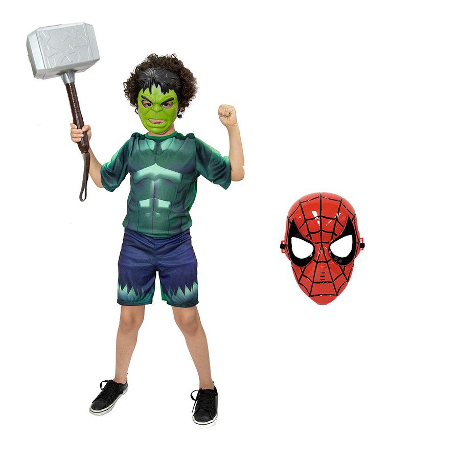 Informações do Produto: a embalagem contem 1 macacão, 2 mascaras (Hulk e Homem Aranha) e 1 martelo Thor.