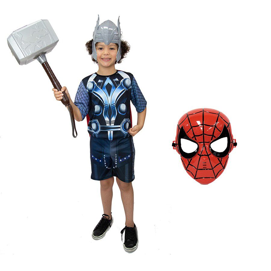 Fantasia Thor e mascara (Thor e Homem Aranha) Martelo e capa Thor, para os meninos que adoram uma boa brincadeira, se fantasiar de super herói favorito agora ficou ainda mais divertido.