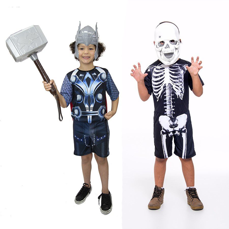 Fantasias Thor e Esqueleto infantil, deixe a imaginação dos pequenos rolarem solta com as fantasias de seus super heróis favoritos, a diversão está garantida.