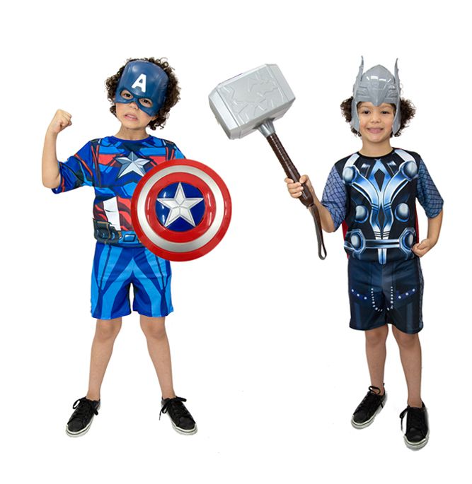 Kit Thor e capitão América, embalagem contém: 2 fantasias ,2 máscaras, 1 escudo e 1 martelo.