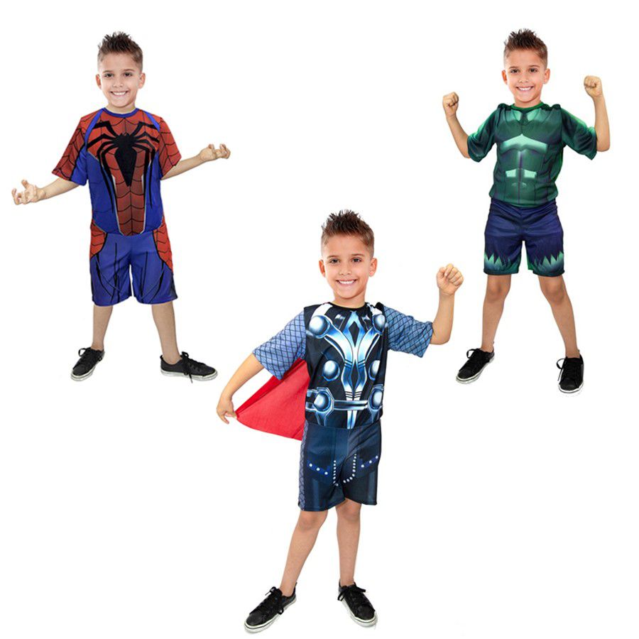 Kit com 3 fantasias de super heróis: Homem Aranha, Thor Ragnarok e Hulk infantil.