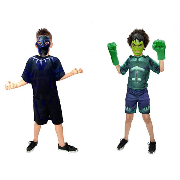 Fantasia do Pantera Negra e Hulk com luvas modelo curto para o verão, os meninos vão amar ter a fantasia do seu super herói preferido. Consulte nossos acessórios para super heróis.
